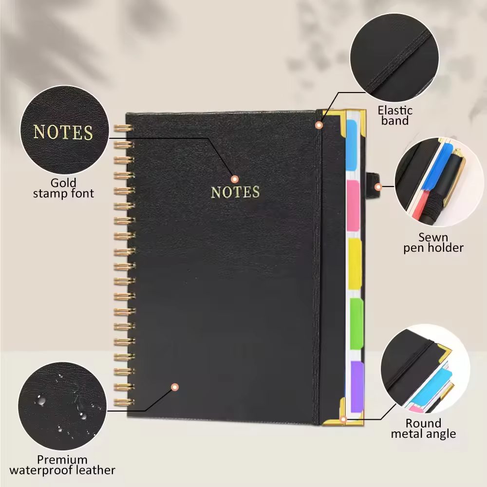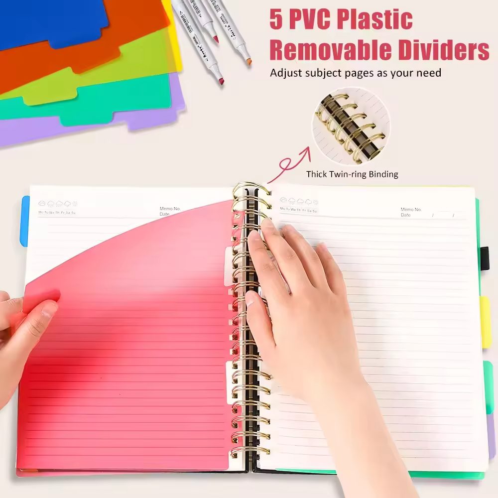 A5 Custom Printing Debossed Logo 80°Lay Flat 5 Subject Hardcover Spiral Notebook Journal with Dividers Tabs