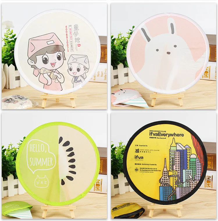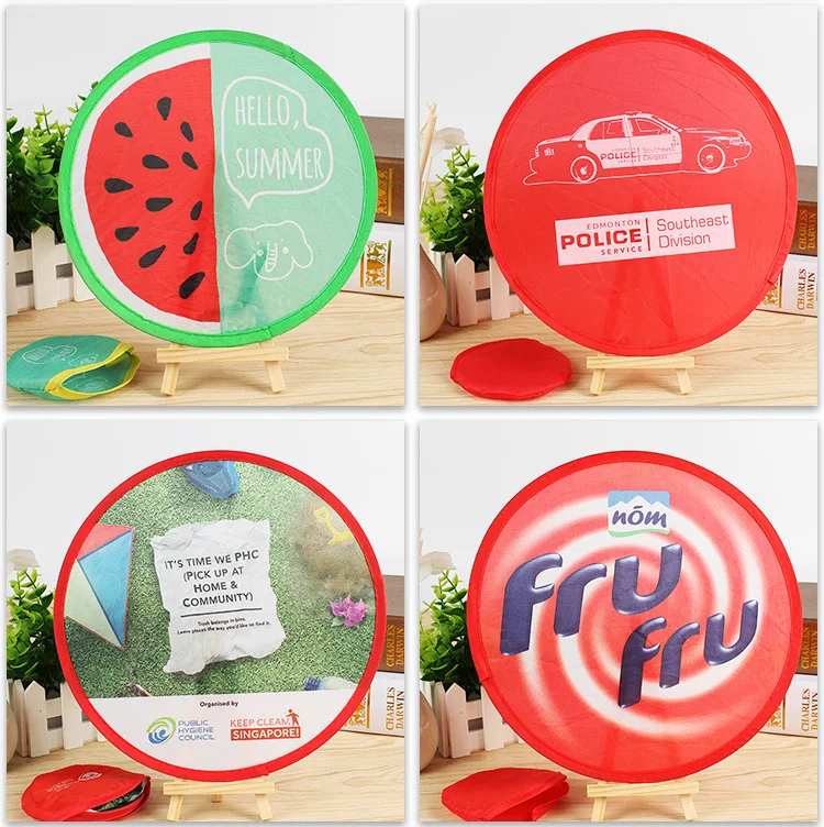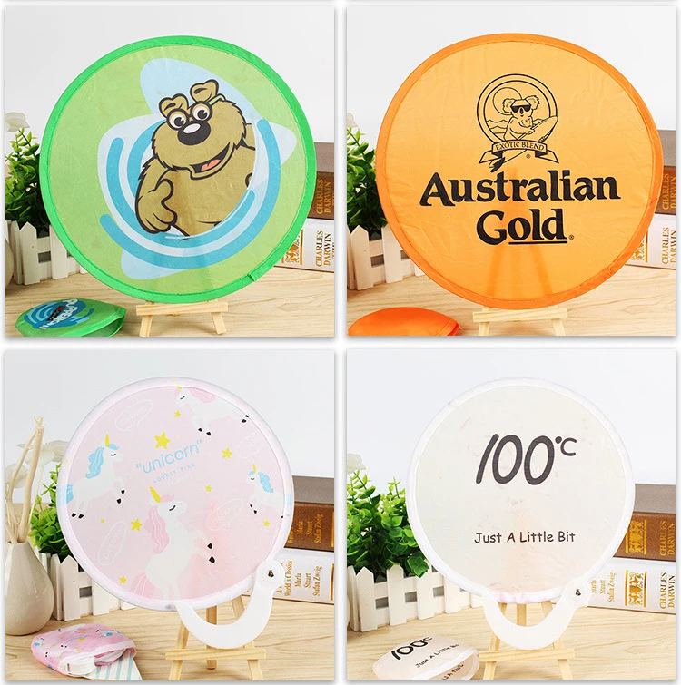 Custom Printed Soft Nylon Flying Disc Round Nylon Hand Folding Fan With Pouch Foldable Flying Disc Customized Logo with Pocket