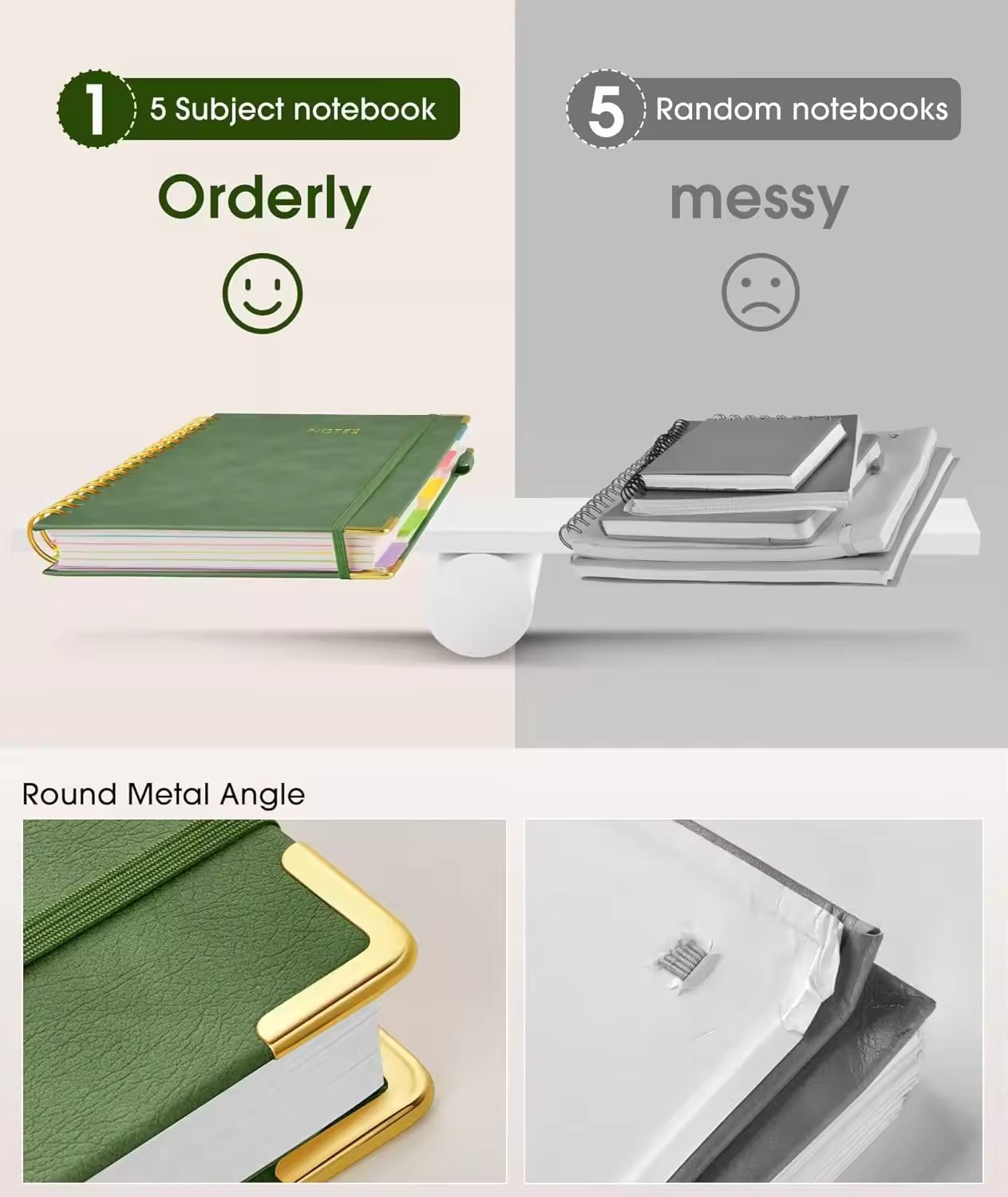 Green Large B5 Leather Hardcover Spiral Notebook 300 Page College Ruled Journal Removable Dividers Tabs 5 Subjects for College